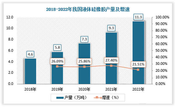 全球發(fā)達國家于20世紀70年代末期開始研究液體硅橡膠技術(shù),到80年代末期開始工業(yè)化生產(chǎn),與此同時,我國液體硅橡膠研究工作起步,至90年代末、21世紀初我國液體硅橡膠進入工業(yè)化生產(chǎn)階段。與發(fā)達國家相比,我國液體硅橡膠行業(yè)起步較晚,但發(fā)展迅速,現(xiàn)階段我國已經(jīng)成為全球液體硅橡膠生產(chǎn)大國。數(shù)據(jù)顯示,2022年我國液體硅橡膠產(chǎn)能達約17萬噸/年,產(chǎn)量達約11.3萬噸。
