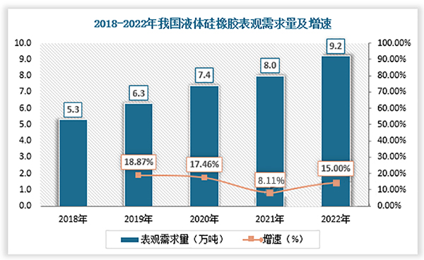 根據(jù)觀研報告網(wǎng)發(fā)布的《中國液體硅橡膠行業(yè)現(xiàn)狀深度分析與投資趨勢研究報告(2023-2030年)》顯示,液體硅橡膠由于耐熱耐候、無毒、電氣絕緣、生物相容性、無色透明、抗撕裂等諸多優(yōu)點而在醫(yī)用、電子電氣、食品母嬰等行業(yè)有廣泛應(yīng)用。液態(tài)硅橡膠因其獨特的性能而成為非常苛刻應(yīng)用的理想材料,近年來需求量持續(xù)增長。據(jù)數(shù)據(jù),2021年我國液體硅橡膠表觀需求量為8萬噸,較上年同比增長8.11%;2022年我國液體硅橡膠表觀需求量為9.2萬噸,較上年同比增長15.00%。