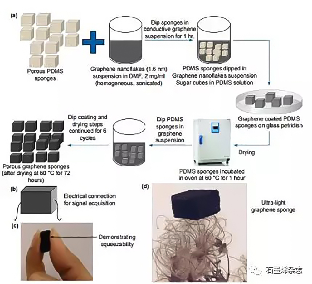 1. 可壓縮石墨烯-PDMS泡沫傳感器的制備:(a)多層石墨烯納米薄片(MLG)滲透PDMS泡沫的示意圖;(b)具有電觸點的單一PDMS-MLG泡沫傳感器的示意圖:(c)石墨烯-PDMS泡沫傳感器的(c)可擠壓性和(d)超輕性。