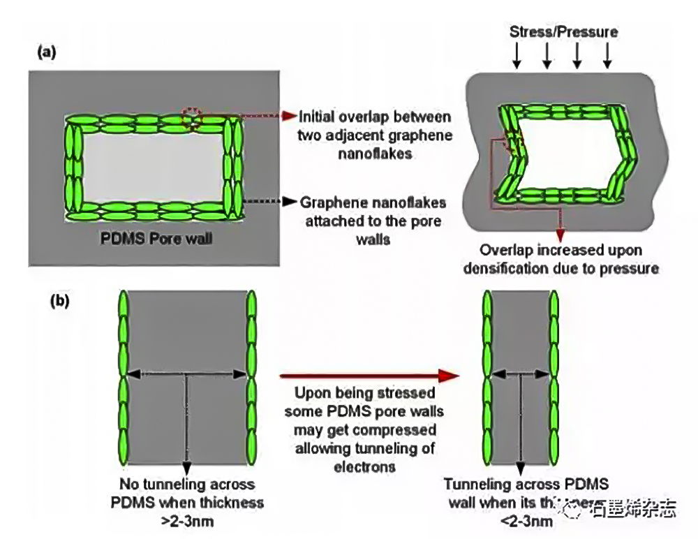 3. 石墨烯-PDMS泡沫傳感器中可能的應變誘導電阻調制機制的示意圖:(a)傳感器中觀察到的應變誘導電阻調制的導電域斷開機制的示意圖;(b)應力誘導隧穿電阻調制的示意圖。