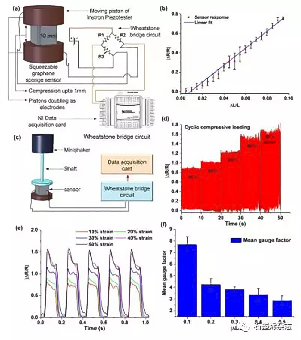 4.石墨烯-PDMS泡沫傳感器表征:(a)用于進行壓阻性表征實驗的裝置的示意圖;(b)石墨烯- PDMS泡沫傳感器的歸一化電阻隨外加壓縮應變的變化曲線高達9.5%;(c)用于在10-50%范圍內對較大的壓縮應變進行壓阻特性實驗的裝置示意圖;(d)在不同應變下(10% ~ 50%),5種不同壓縮載荷下傳感器響應歸一化電阻變化曲線圖;(e)疊加圖,顯示了傳感器在10%-50%五種不同壓縮應變下的歸一化電阻變化;(f)柱狀圖顯示了石墨烯- PDMS泡沫傳感器在10%-50%五種不同壓縮應變下的計算應變因子。