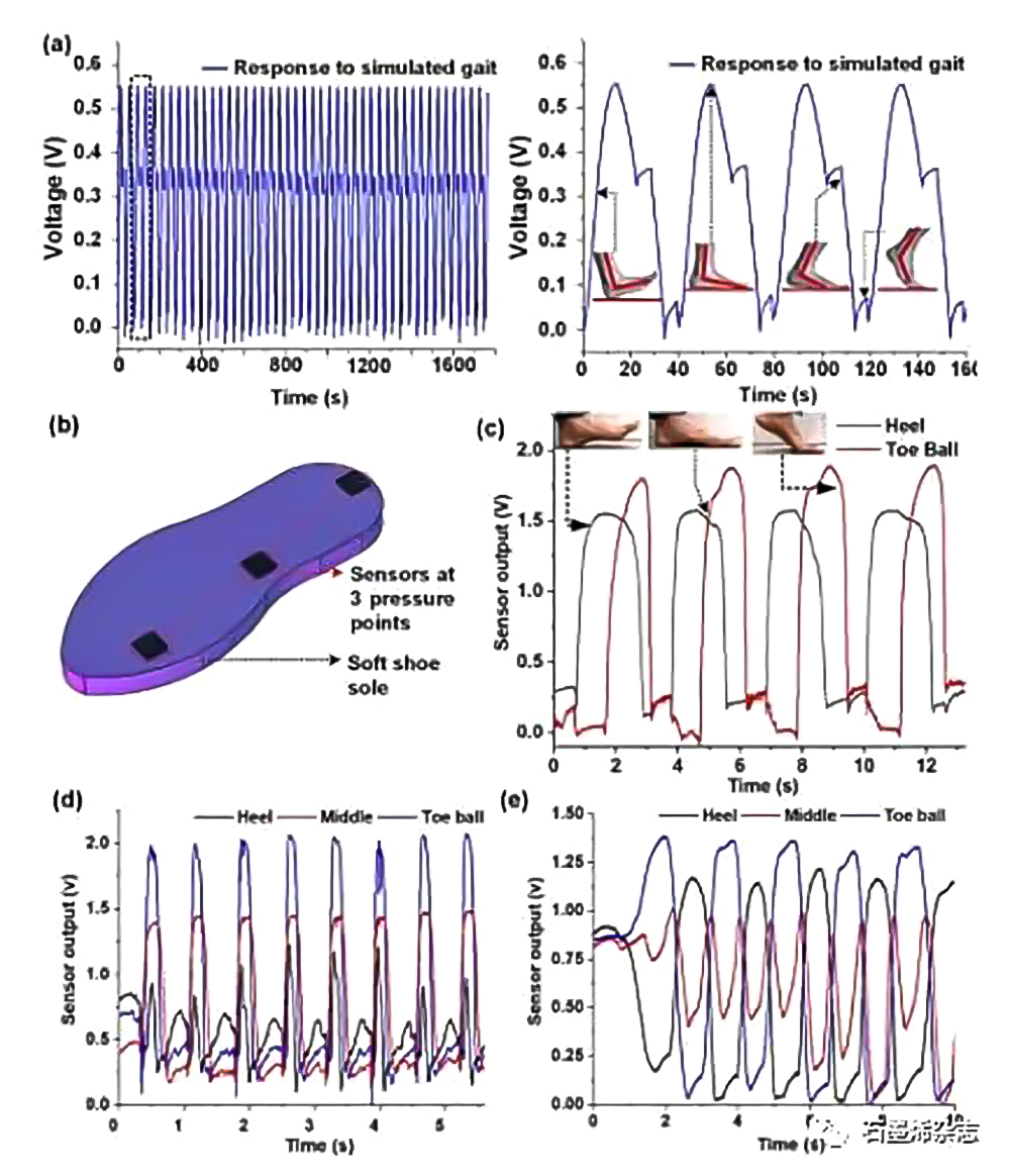 針對個性化醫(yī)療監(jiān)護的需求,對柔性、超敏、可擠壓、可貼裝和可穿戴傳感器的需求日益增長,因此有必要探索基于納米聚合物復合材料的新型傳感器。下面介紹一下關于敏感的3D可壓縮石墨烯-聚二甲基硅氧烷(PDMS)泡沫壓阻傳感器。該傳感器通過將多層石墨烯納米顆粒注入糖基多孔PDMS泡沫結構中來實現(xiàn)。所制得的壓阻式泡沫塑料傳感器的靜態(tài)和動態(tài)壓縮應變測試結果顯示,在0-50%的應變范圍內,存在兩個線性響應區(qū)域,平均應變因子為2.87~8.77。此外,動態(tài)刺激響應揭示了傳感器的能力,有效地跟蹤動態(tài)壓力高達70赫茲的頻率。該傳感器在36000次循環(huán)壓縮載荷和100次完整的人類步態(tài)運動周期中顯示出很高的穩(wěn)定性。通過仿真步態(tài)模型和實時步態(tài)表征實驗,3D傳感泡沫體可精確的對人體步態(tài)進行監(jiān)測。實時步態(tài)實驗表明,鞋底三個位置的壓力分布信息不僅可以區(qū)分步行和跑步等不同的人類步態(tài),還可以識別可能的跌倒情況。本論文還展示了傳感器區(qū)分足部解剖結構的能力,如扁平足(低中心弓)和中弓腳,這是更有效的生物力學。此外,傳感器能夠感知各種基本的關節(jié)運動反應,證明它們適合于個性化醫(yī)療應用。