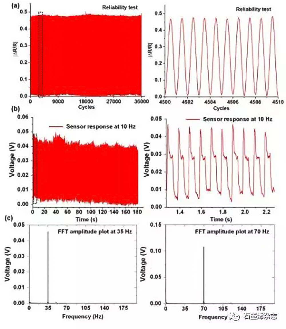5. 循環(huán)壓縮加載和動態(tài)應變傳感特性的石墨烯泡沫塑料傳感器:(a)傳感器在5%壓縮應變下對循環(huán)加載和卸載的響應;(b)傳感器在10 Hz時時域響應的曲線圖;(c)在35 Hz和70 Hz時傳感器響應的FFT振幅圖。