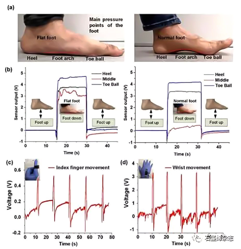 7. 石墨烯- PDMS泡沫傳感器在足部解剖和人體運動監(jiān)測中的應用:(a)比較低足弓/扁平足與中等足弓生物力學效率的圖像;(b)比較兩種不同足型獲得的SSA壓力響應;(c)傳感器對食指輕彈的響應;(d)傳感器對手腕輕彈的響應。