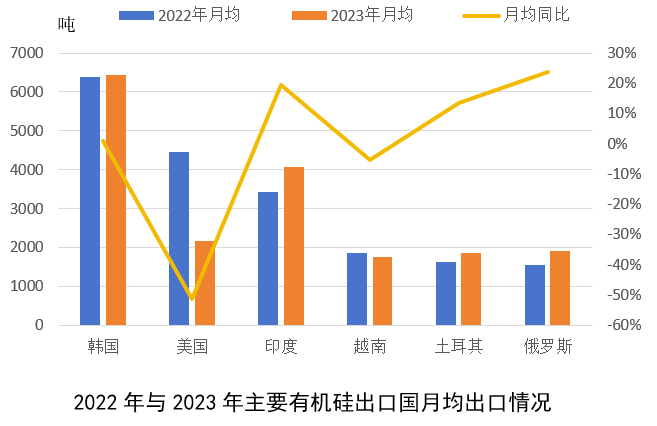 2.對美有機硅出口自2022年7月之后大幅下滑,2023年月均出口同比大降超50%,美國作為我國有機硅第二大出口國地位被印度取代;
