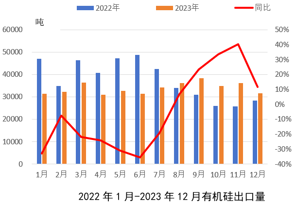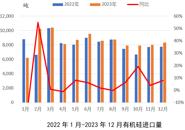 從進口量來看,2023年1-12月有機硅進口整體同比小幅增加5.1%。進口增加主要因為一方面因疫情管控放開國外高端有機硅產品進口有所恢復,另一方面國外需求下滑,部分外企銷售重心轉向國內市場。