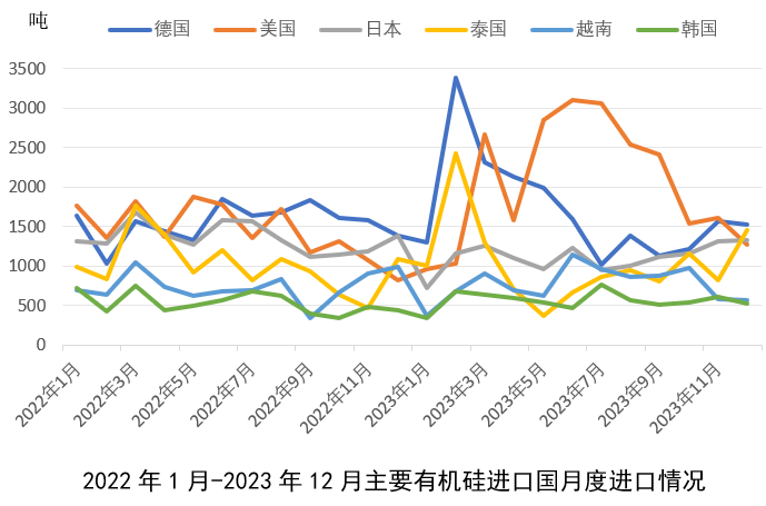 1.2023年1-12月,對美國和德國有機硅進口大幅增加,月均同比增加分別約46%與12%,美國重新成為我國最大有機硅進口國;