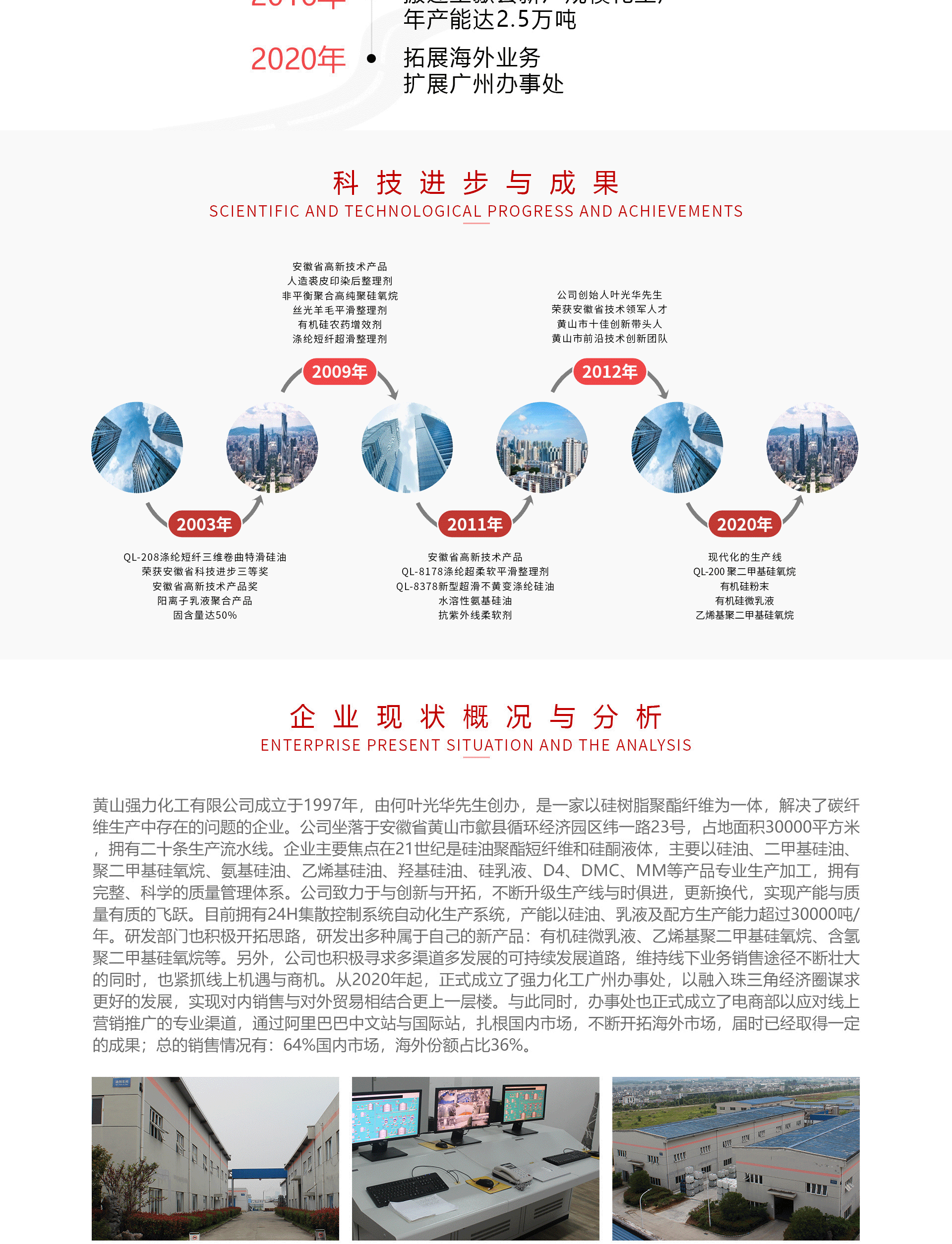 黃山市強(qiáng)力化工有限公司是一家專注于有機(jī)硅新材料,集研發(fā)、生產(chǎn)與銷售為一體的綜合性高新技術(shù)企業(yè)。公司已是有機(jī)硅行業(yè)內(nèi)較為知名的品牌,傾力于打造高品質(zhì)有機(jī)硅產(chǎn)品:二甲基硅油、乙烯基硅油、氨基硅油、乳化硅油、羥基硅油、含氫硅油與紡織品硅油等。砥礪前行,踔厲奮發(fā),強(qiáng)力純硅油,更高技術(shù),更好硅油。