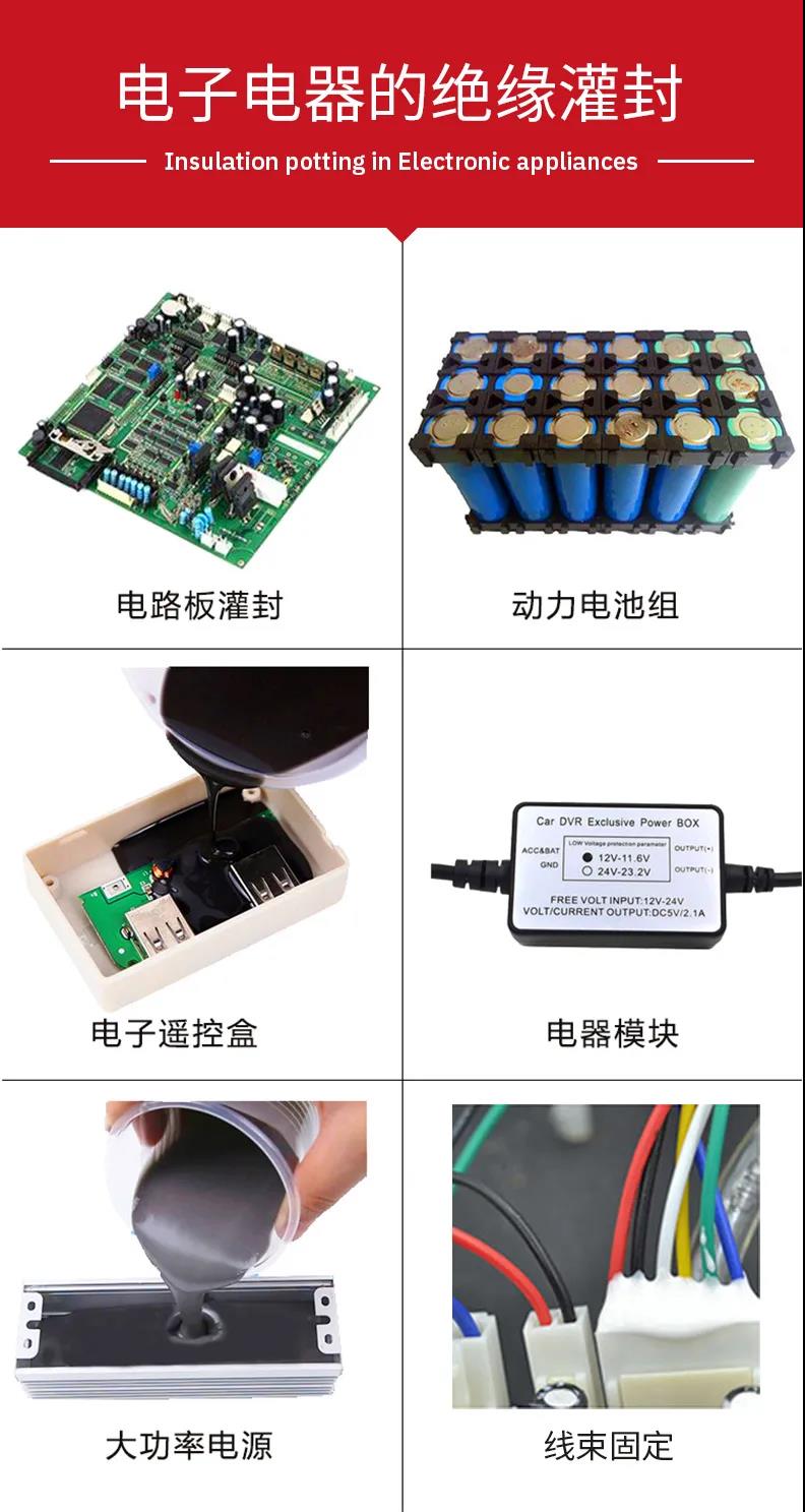 電子產(chǎn)品在制造完成之后,往往需要再進(jìn)行―道灌封工藝,使其與外界隔絕,以此提高電子產(chǎn)品的抗震能力、防水性能,防止電子元器件受到自然環(huán)境的侵蝕,延長電子產(chǎn)品的使用壽命。目前用于灌注在電子元器件內(nèi)的灌封材料多種多樣,使用較多主要還是:聚氨酯材質(zhì)、環(huán)氧樹脂材質(zhì)和有機(jī)硅材質(zhì)。其中使用最多的還是有機(jī)硅材質(zhì)的灌封膠,因各種優(yōu)良的特性而被廣泛應(yīng)用。